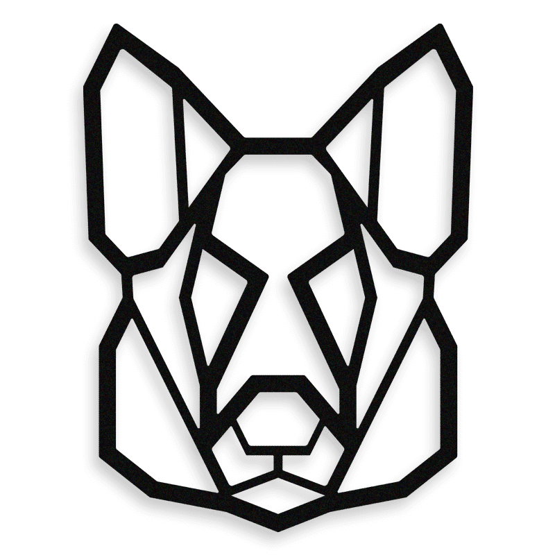 יצירת מתכת לקיר בצורת ראש כלב גיאומטרי – נוכחות מרשימה עם עומק רגשי.